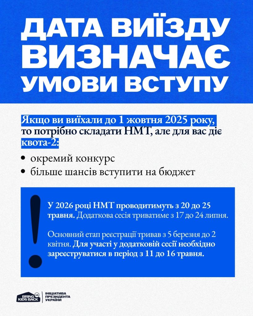 Зібрали ключове: як вступити у 2026 році, які діють пільги для вступників із ТОТ, та як працює квота-2. Умови вступу залежать від дати виїзду. Якщо ви досі перебуваєте на ТОТ або виїхали після 1 жовтня 2025 року — вступ можливий без НМТ, через співбесіду в університеті. Якщо виїзд був раніше — потрібні результати НМТ, але діє квота-2. Квота-2 — це окремі бюджетні місця для вступників з ТОТ і територій активних бойових дій. Вступ відбувається в окремому конкурсі, що дає більше шансів отримати бюджет. У більшості університетів це близько 10% місць, а в переміщених або прифронтових — до 40%. Вступники, які перебувають на ТОТ або виїхали після 1 жовтня 2025 року, можуть самостійно обрати: вступати за результатами НМТ або складати співбесіду. Водночас, якщо вступ відбувається за співбесідою на контракт, державний грант на навчання не надається. Навіть якщо не вдалося пройти на бюджет за квотою — після зарахування на контракт можна подати заяву на переведення на бюджетні місця. Допомогу зі вступом забезпечують освітні центри «Крим-Україна» та «Донбас-Україна», які працюють з 1 червня до 30 вересня. Вони супроводжують на всіх етапах: від складання необхідних оцінювань до подачі документів і проходження співбесіди. Частину процесів можна пройти дистанційно, ще до виїзду. На час вступу надається безоплатне житло, а також передбачена додаткова державна підтримка, стипендії та допомога з адаптацією після переїзду. Якщо ви тільки плануєте виїзд — звертайтеся. У межах ініціативи Bring Kids Back UA допомагають виїхати безкоштовно, конфіденційно та з повним супроводом — навіть якщо немає документів. Для кожного підбирають безпечний маршрут. Якщо ви не готові вступати одразу, доступні підготовчі програми, зокрема «нульовий курс», щоб підтягнути знання з українознавчого компоненту, адаптуватися та спокійно підготуватися до навчання. Вступ і навчання не потрібно проходити самостійно — на кожному етапі є супровід і підтримка. Якщо вам потрібна інформація про вступ до українських університетів, процедуру подання документів або освітні можливості — звертайтесь до організацій та державних інституцій за посиланням у bio профілю. osvita.tot@bringkidsback.org.ua Here’s what you need to know: how to apply in 2026, what benefits are available for applicants from TOT, and how quota-2 works. Admission conditions depend on the date of departure. If you are still in temporarily occupied territories or left after October 1, 2025 — you can apply without the NMT, through an interview at the university. If you left earlier — NMT results are required, but quota-2 applies. Quota-2 provides separate state-funded places for applicants from TOT and territories of active hostilities. Admission is conducted through a separate competition, which increases the chances of getting a state-funded place. In most universities, this is about 10% of places, and in relocated or frontline institutions — up to 40%. Applicants who remain in TOT or left after October 1, 2025 can choose: apply using NMT results or take an entrance interview. At the same time, if you are admitted to a fee-based program through an interview, you are not eligible for a state grant to partially cover tuition. Even if you do not secure a quota-funded place, you can apply for transfer to a state-funded place after enrolling on a fee-paying basis. Admissions support is provided by the “Crimea–Ukraine” and “Donbas–Ukraine” Education Centers, which operate from June 1 to September 30. They assist at every stage — from taking required assessments to submitting documents and completing interviews. Part of the process can be done remotely, even before leaving TOT. Free accommodation is provided during the admission period, along with additional state support, scholarships, and assistance with adaptation after relocation. If you are planning to leave, you can reach out for help. Within the Bring Kids Back UA initiative, assistance is provided free of charge, confidentially, and with full support — even if you do not have documents. A safe route is arranged for each individual. If you are not ready to apply immediately, preparatory programs are available, including a “zero course” to help you strengthen key subjects, adapt, and prep